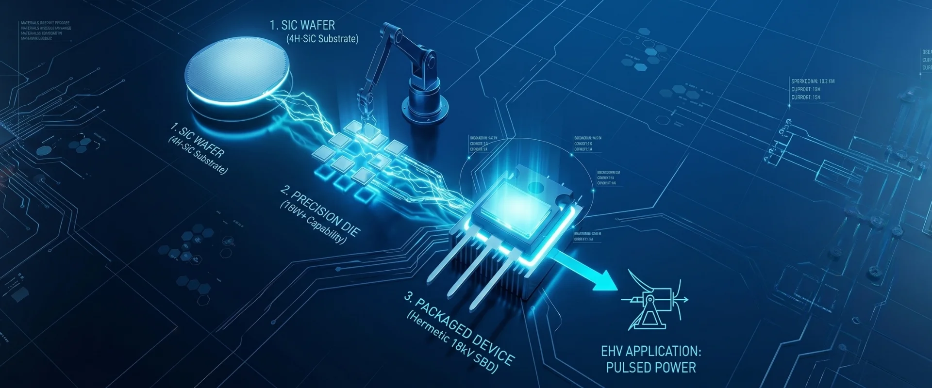 Near-Zero Switching Loss: Our 5kV and 10kV SiC SBDs eliminate the traditional “recovery charge” bottleneck, allowing for ultra-high frequency pulse modulation required for directed energy precision.
